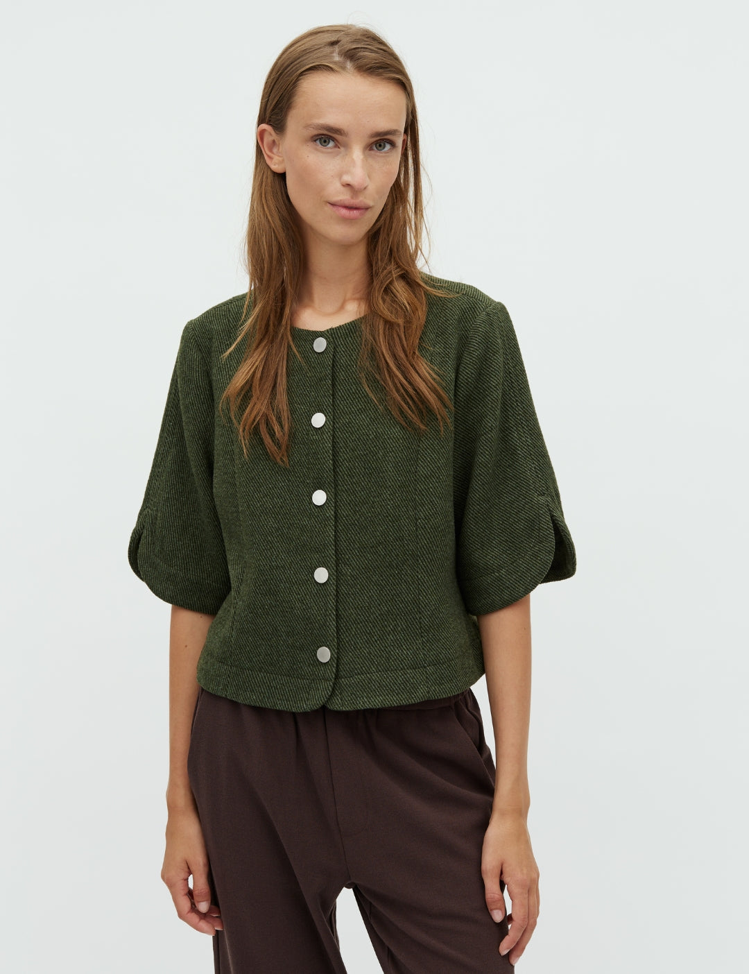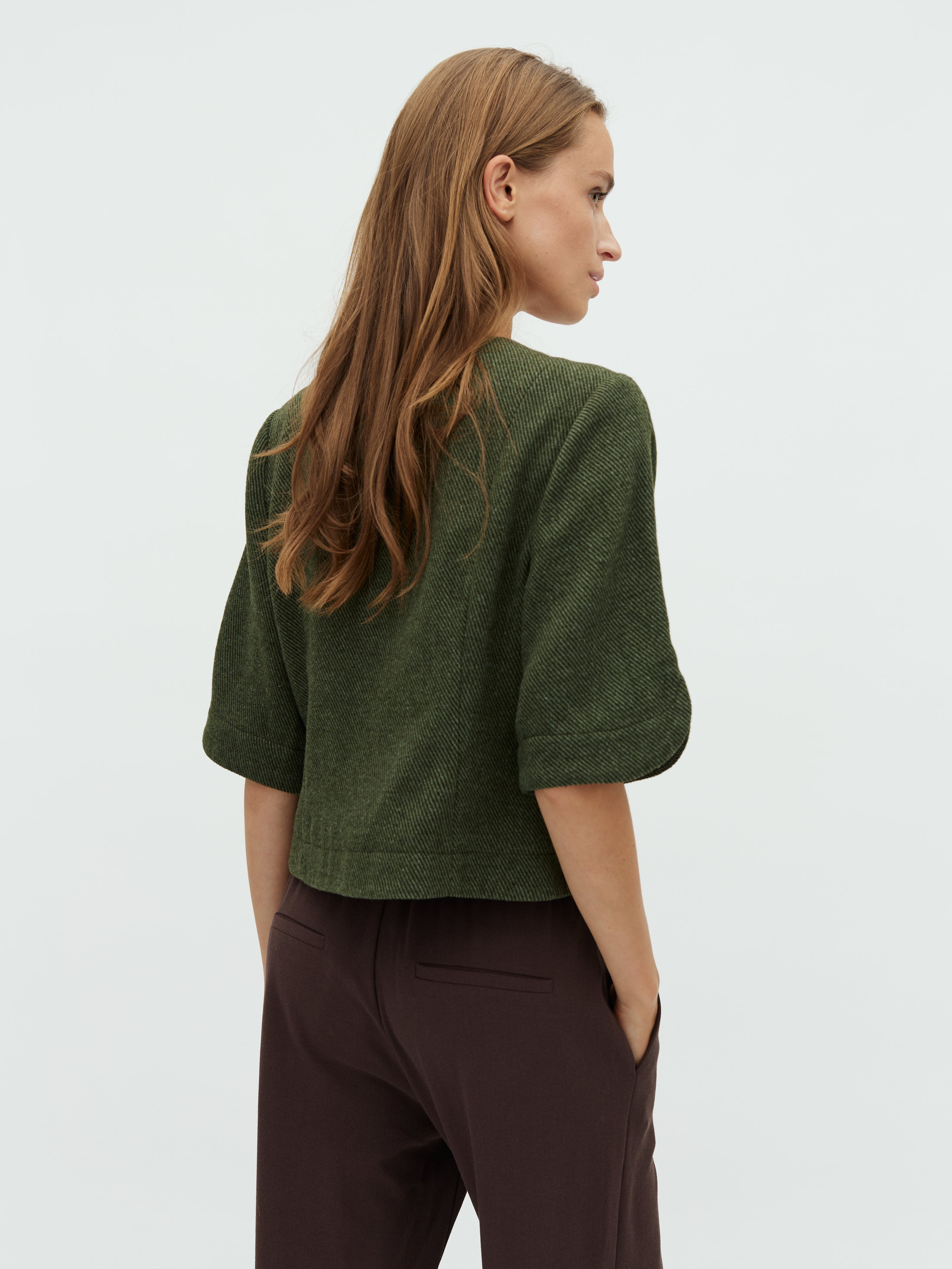 Kurzarmbluse in schwerem Fischgrätmuster.