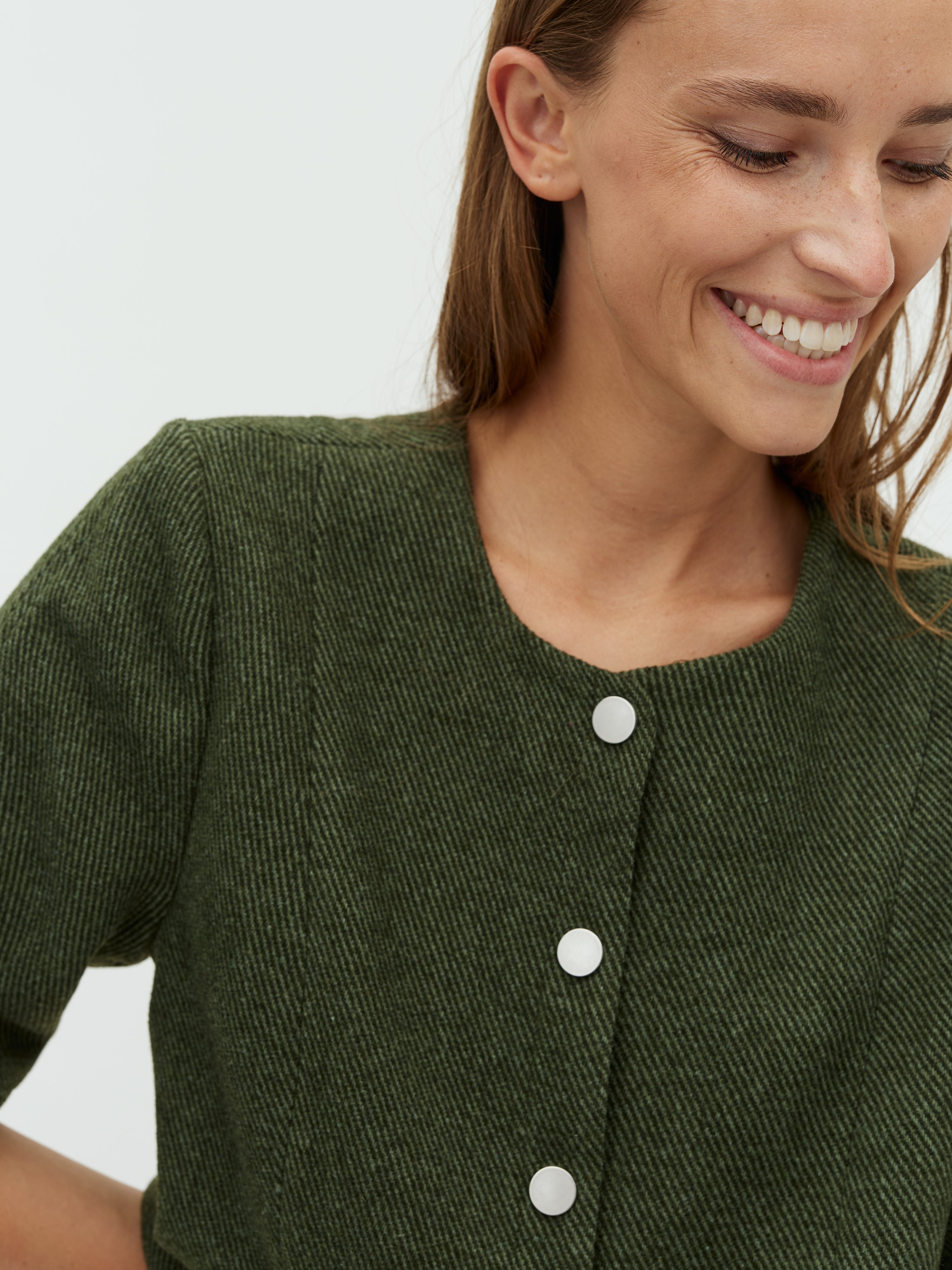 - Schließt mit silberfarbenen Knöpfen