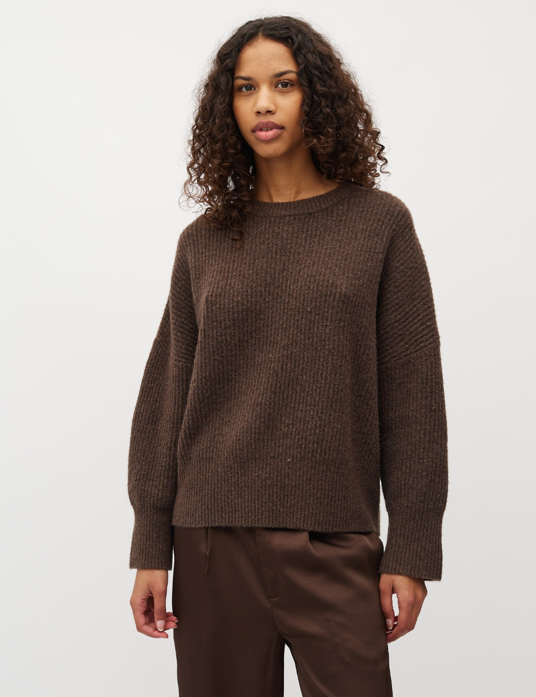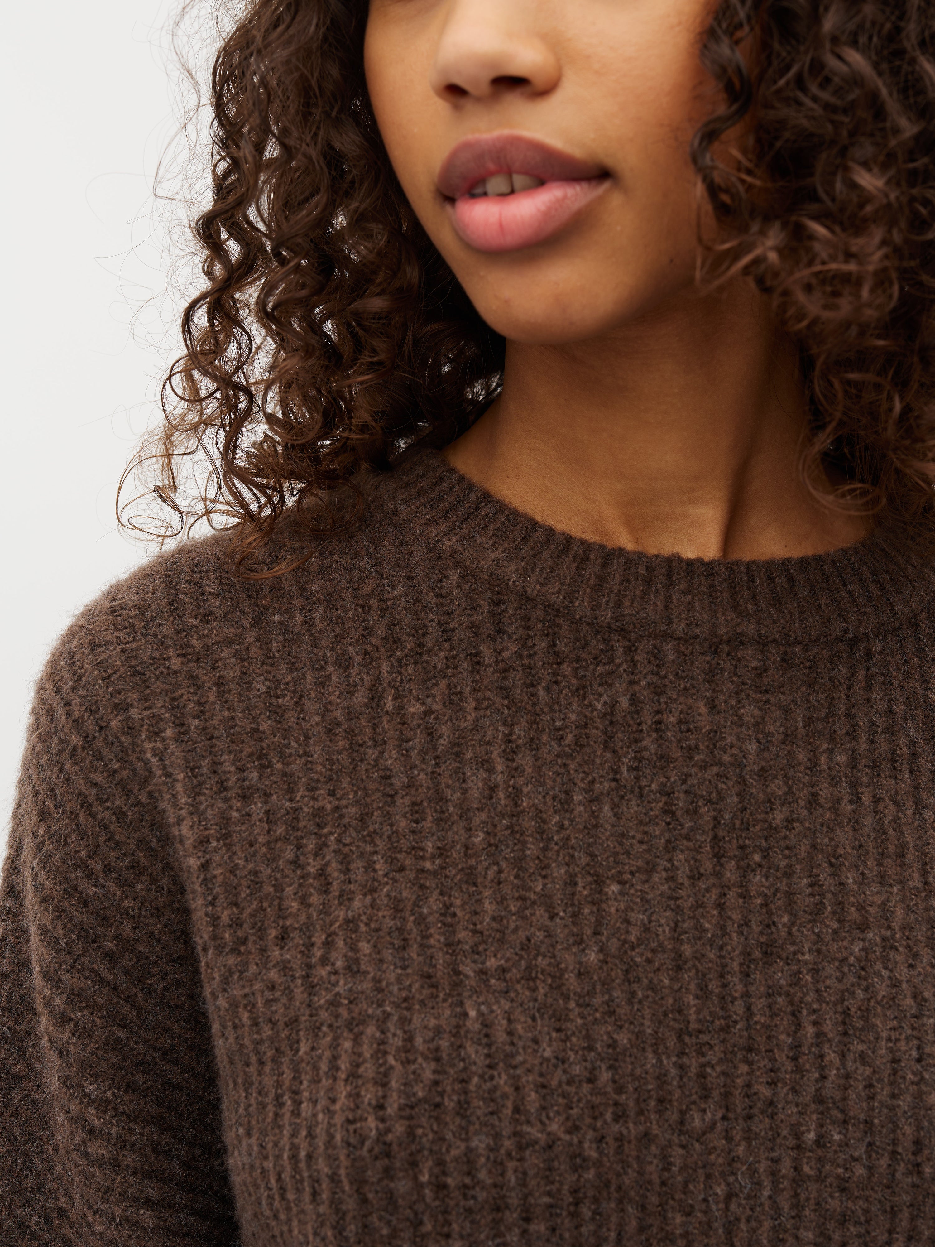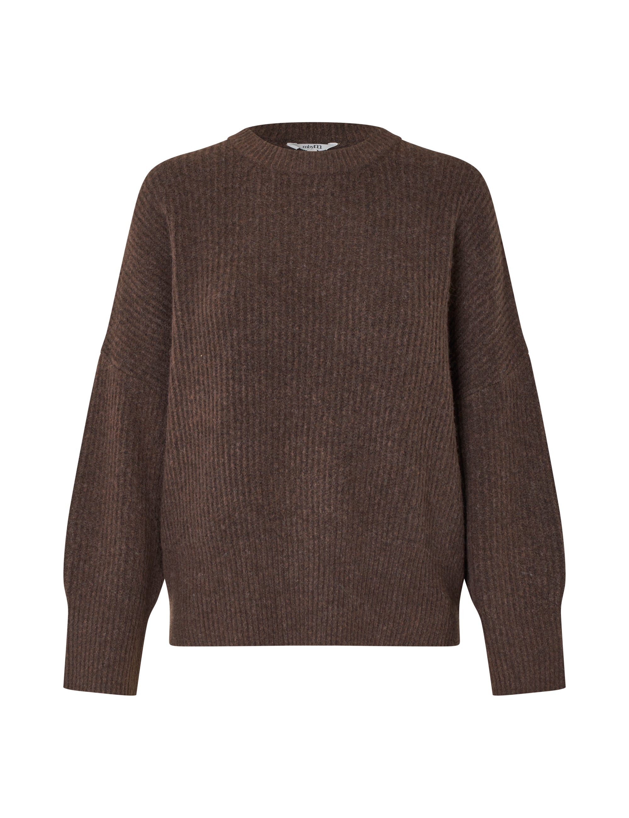 Strickpullover mit Rundhalsausschnitt und überschnittenen Schultern.