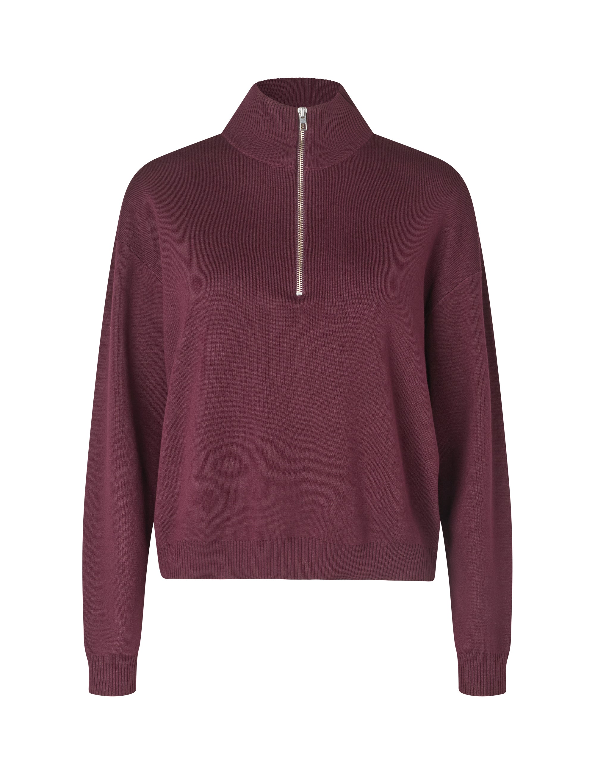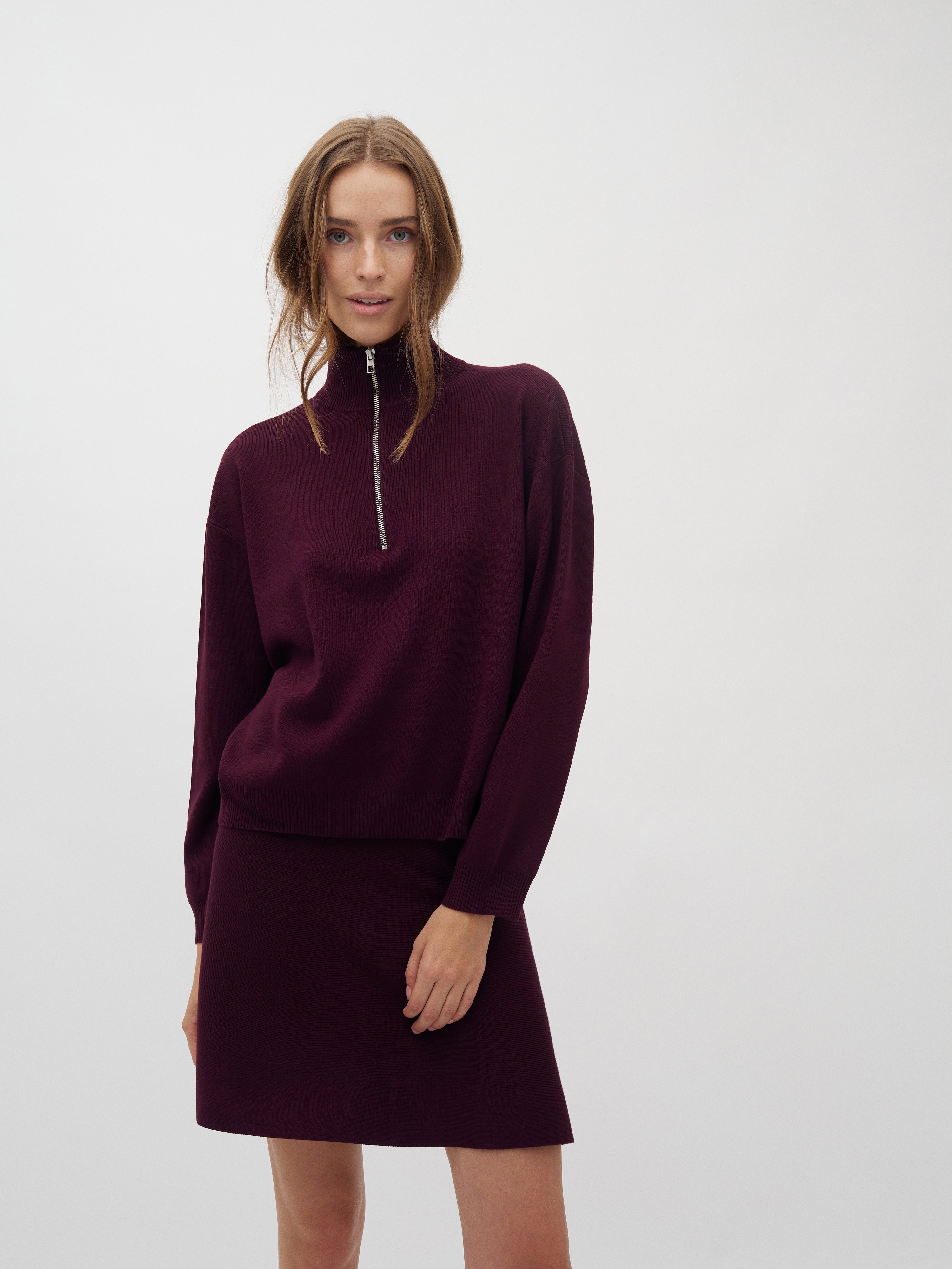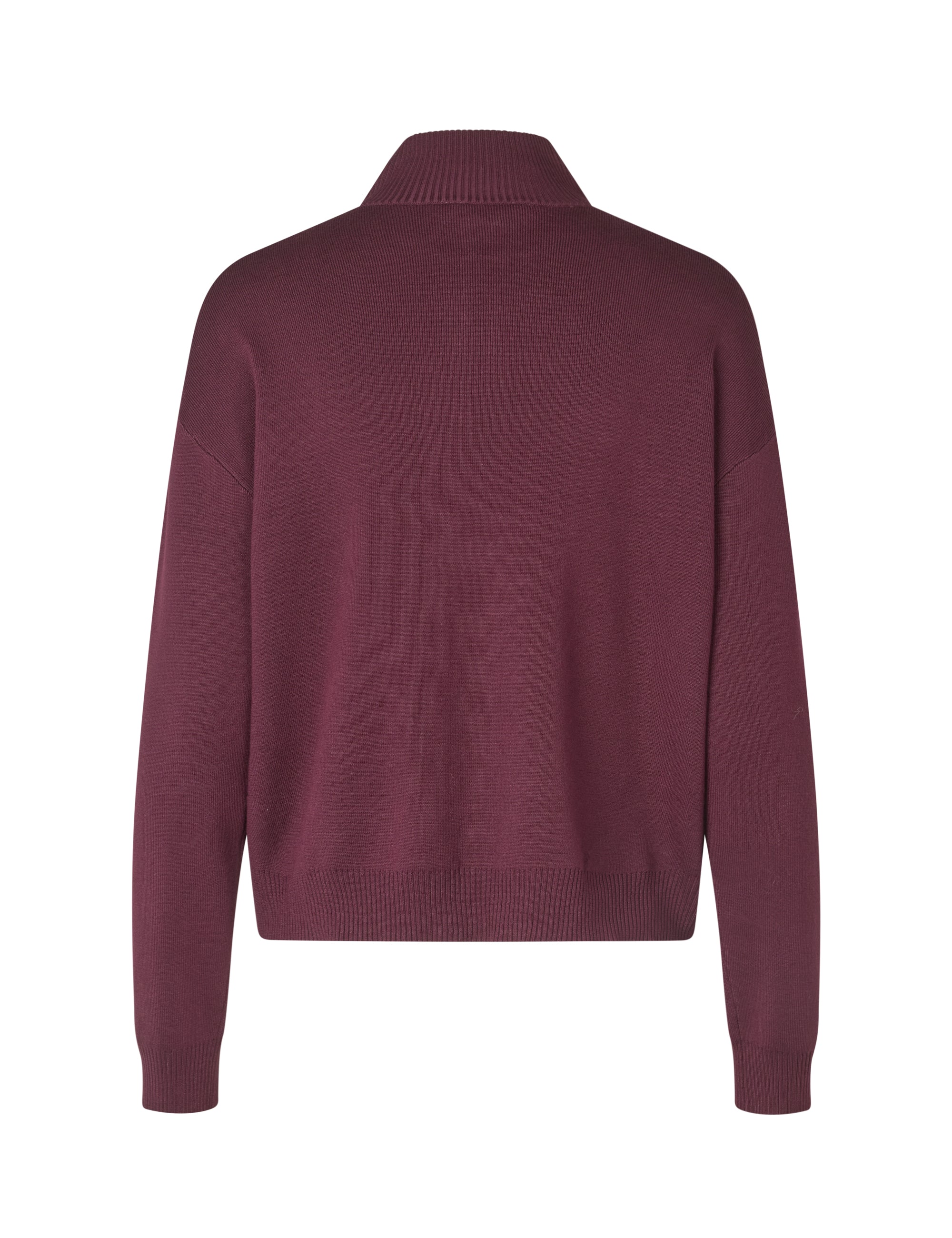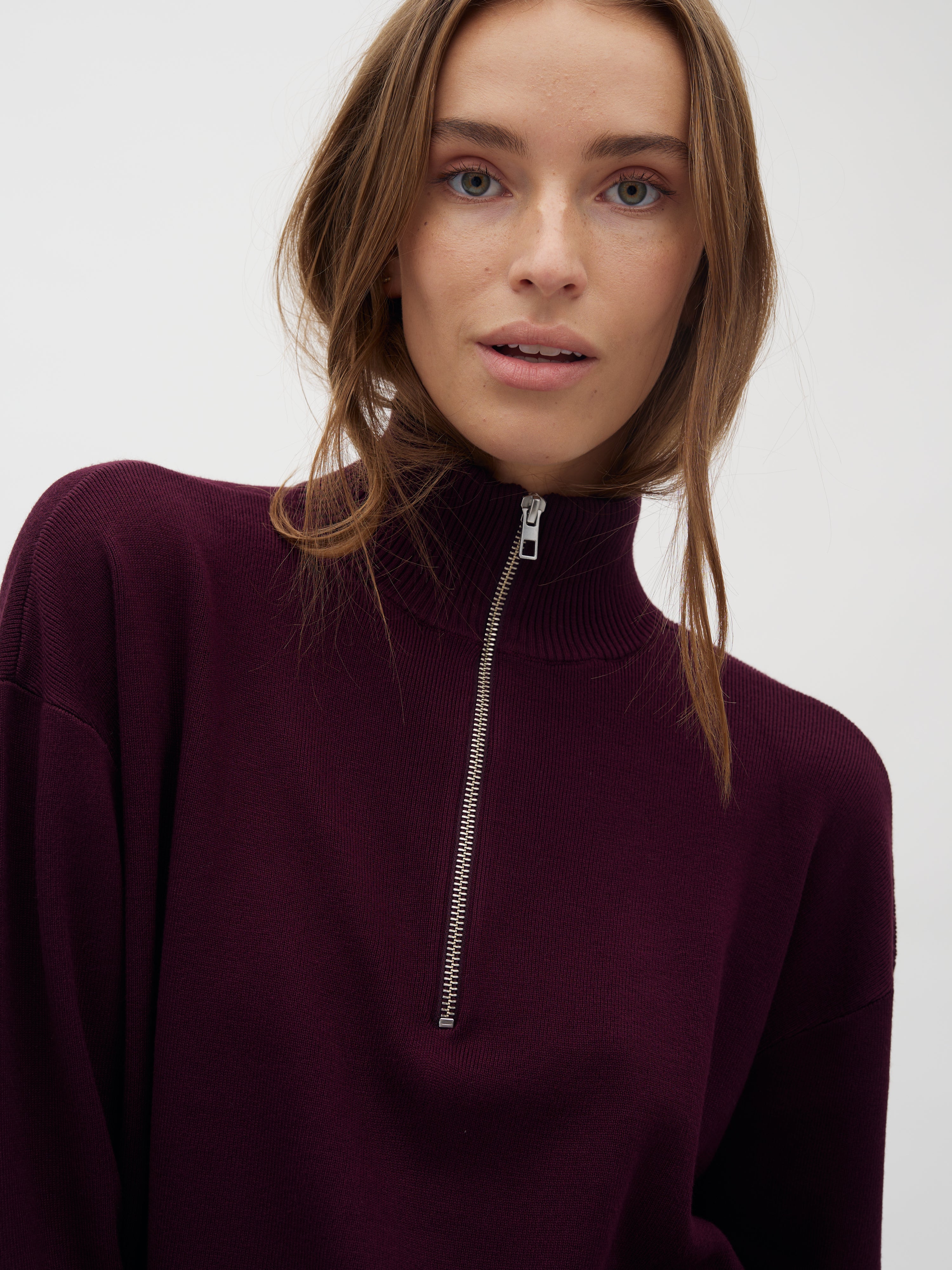 Langärmeliger Strickpullover mit hohem Kragen und Reißverschluss.