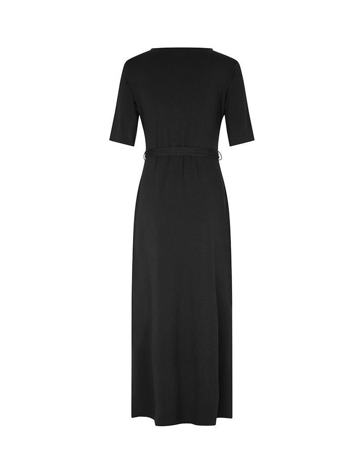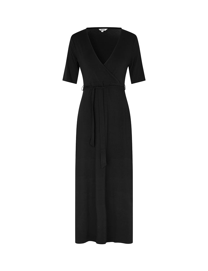 Langes Kleid mit kurzen Ärmeln, Wrap-Look und Bindeband.