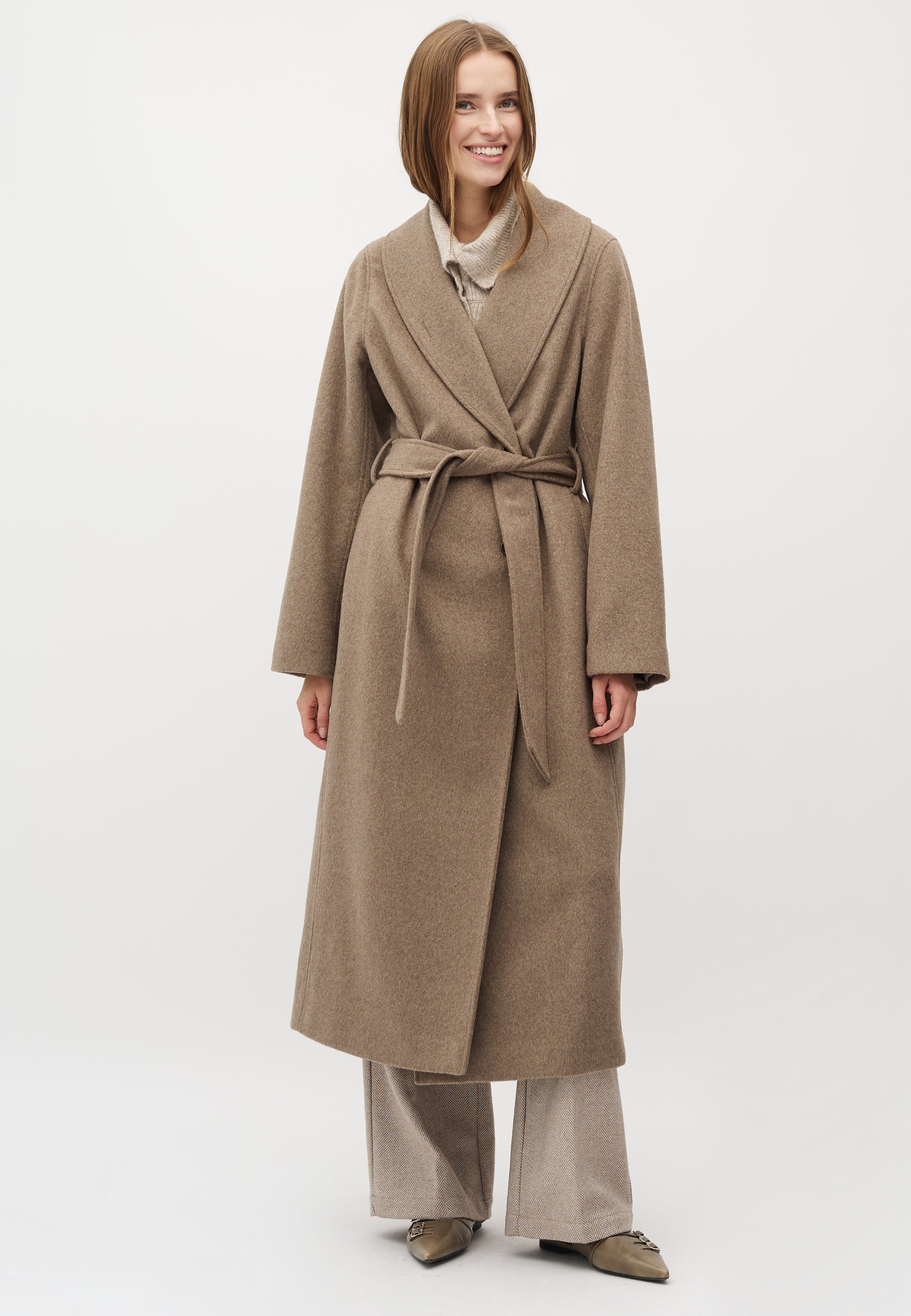 Langer Mantel mit Bindebändern.